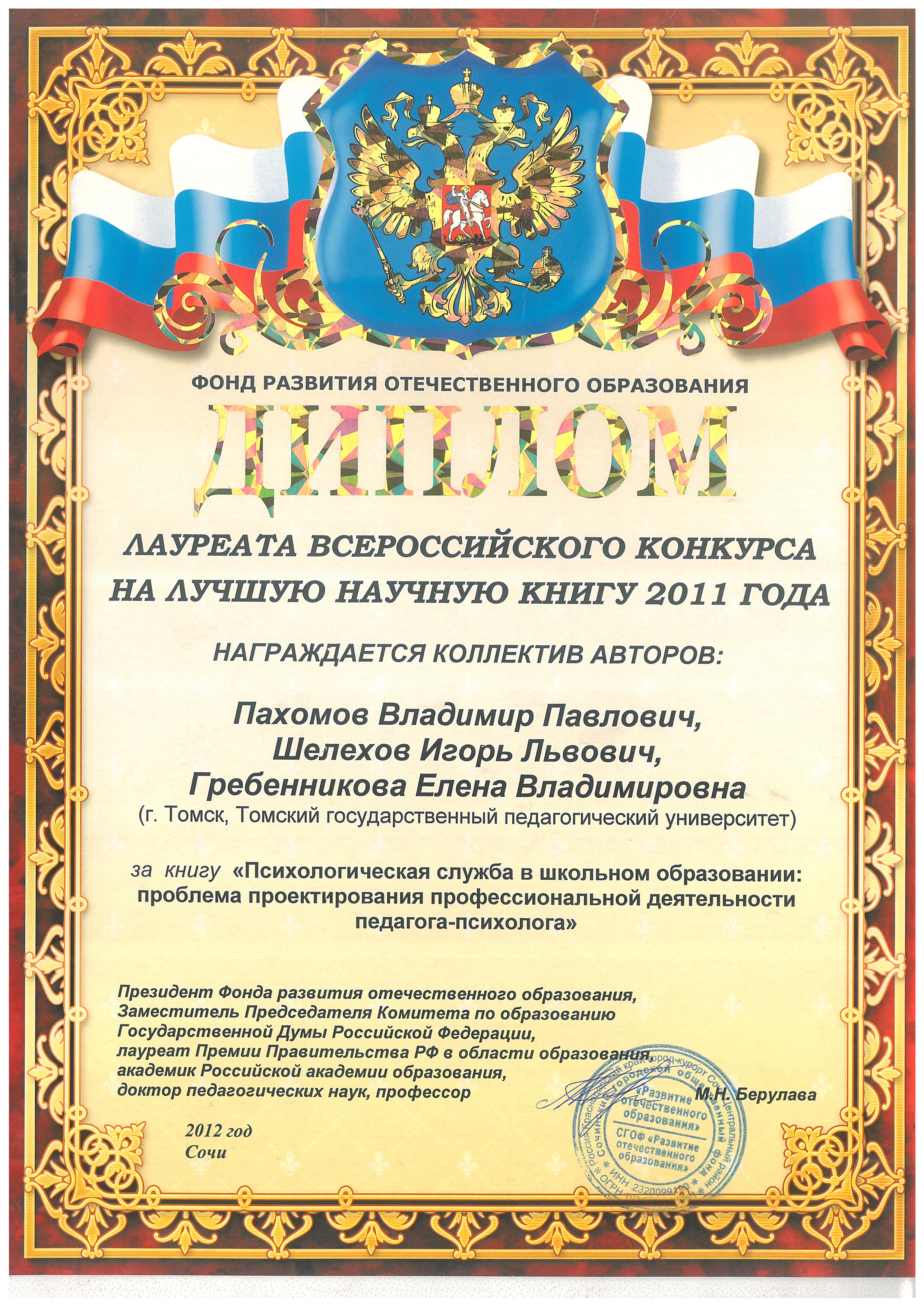 Сотрудники нашего факультеа приняли участие во всероссийской выставке-презентации учебно-методических пособий г.Сочи. Их работы были высоко оценены и отмечены дипломами "Золотого фонда отечественной науки" в номинации лучшее учебно-методическое издание в отрасли. Награжден коллектив авторов Пахомов В.П., Шелехов И.Г., Гребенникова Е.В. за лучшую книгу 2011 г. "Психологическая служба в школьном образовании: проблема проектирования профессиональной деятельности педагога-психолога"