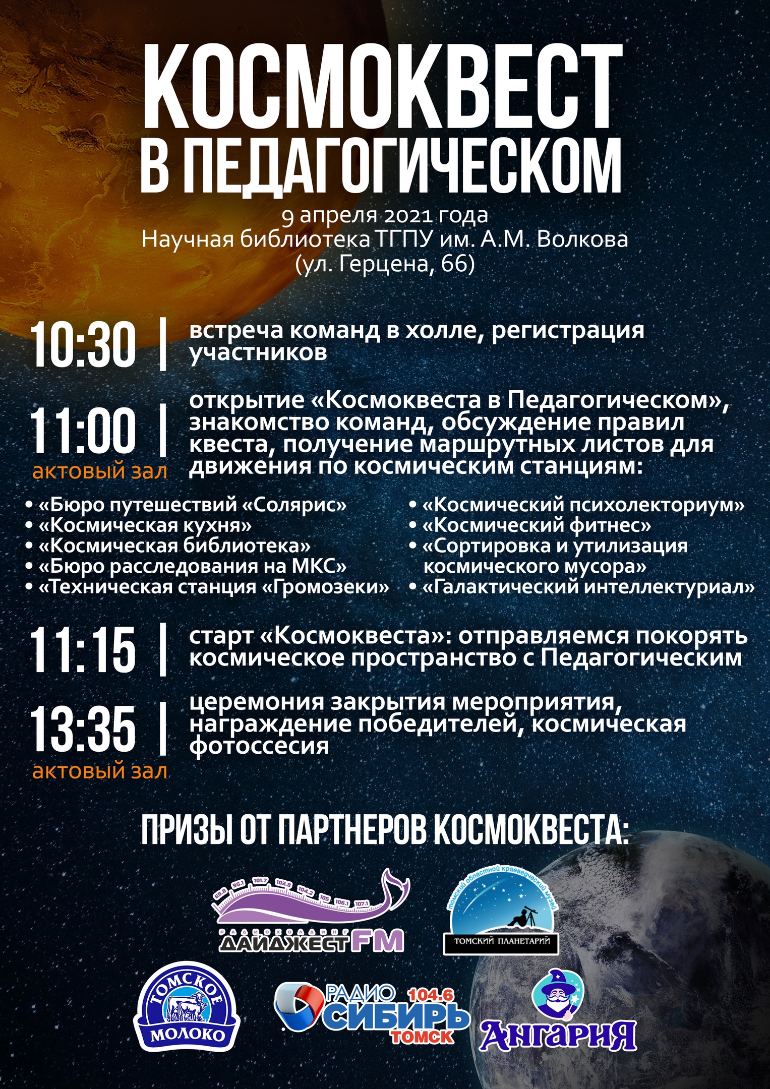 - «Космоквест в Педагогическом»: учащиеся 9-10 классов г. Томска, 10.30-15.00 часов, ул. Герцена, 66 (Научная библиотека им. А.М. Волкова ТГПУ).
