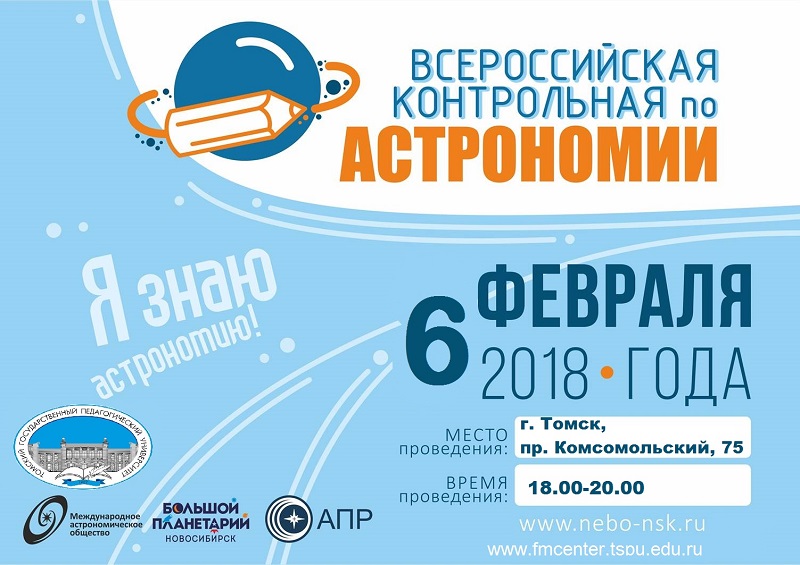 6 февраля 2018 года Томский государственный педагогический университет (Центр дополнительного физико-математического и естественнонаучного образования) выступит площадкой для проведения Всероссийской контрольной по астрономии.