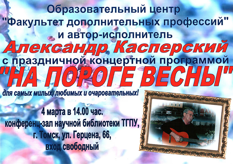 Студия «Авторской песни и обучения игре на гитаре» Образовательного центра «Факультет дополнительных профессий» Томского государственного педагогического университета приглашает на концерт «На пороге весны», посвящённый празднику 8 марта. На праздничном музыкальном вечере вы услышите живую гитарную музыку и песни о весне, любви, жизни, которые подарит гостям Александр Касперский, известный томский автор-исполнитель, дипломант и лауреат бардовских фестивалей, проводимых в Сибирском регионе.