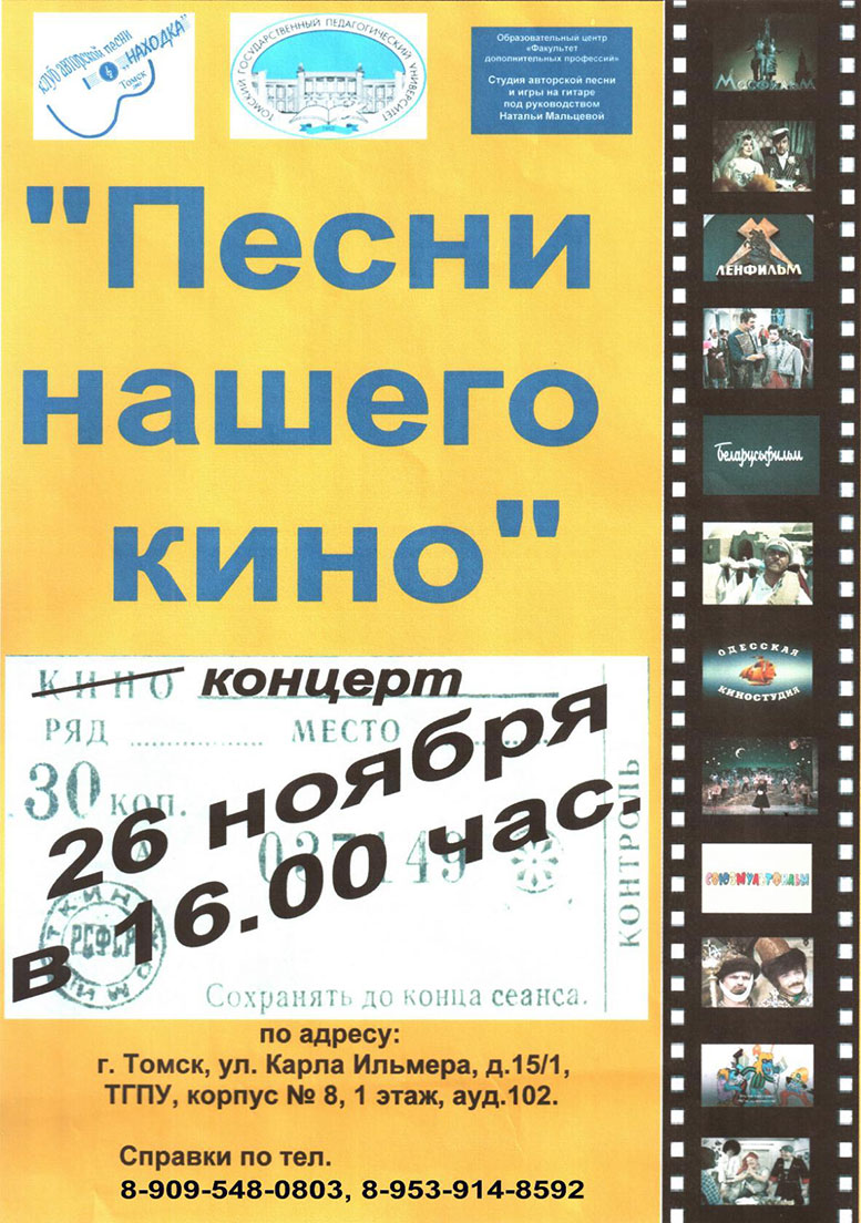 Факультет дополнительных профессий ТГПУ совместно с клубом авторской песни «Находка» организует музыкальный вечер «Песни нашего кино». В программе концерта, приуроченного к году российского кино, два часа живой гитарной музыки, вокала, исполнения песен из советских фильмов. У гостей также будет возможность услышать от организаторов мероприятия интересные факты и истории, которые сопровождали съемочный процесс любимых картин и случались при написании песен.