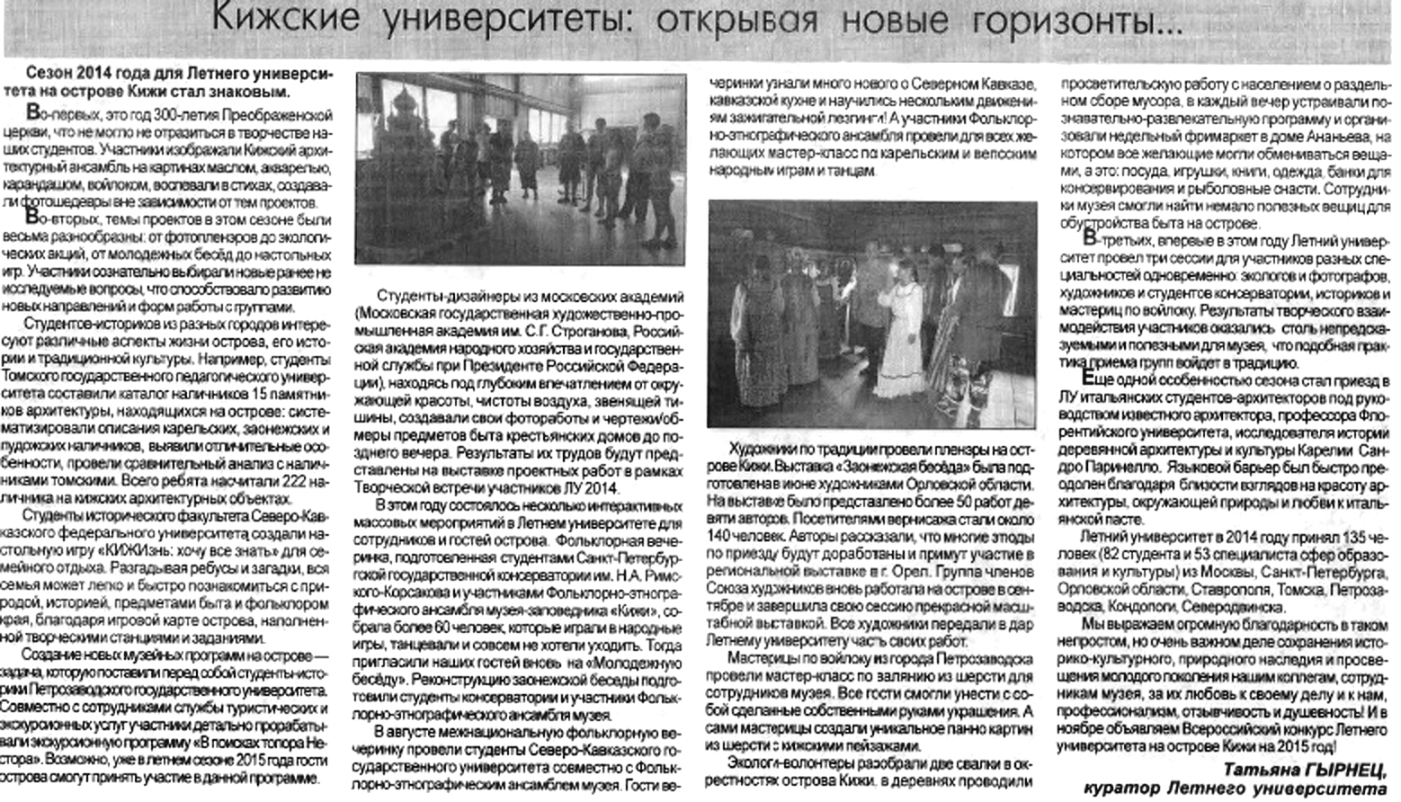 - Гырнец Т. Кижские университеты: открывая новые горизонты… // КИЖИ (Газета ФГБУК Государственный историко-архитектурный и этнографический музей-заповедник «КИЖИ»). № 9 (115) октябрь 2014 г. С. 5.