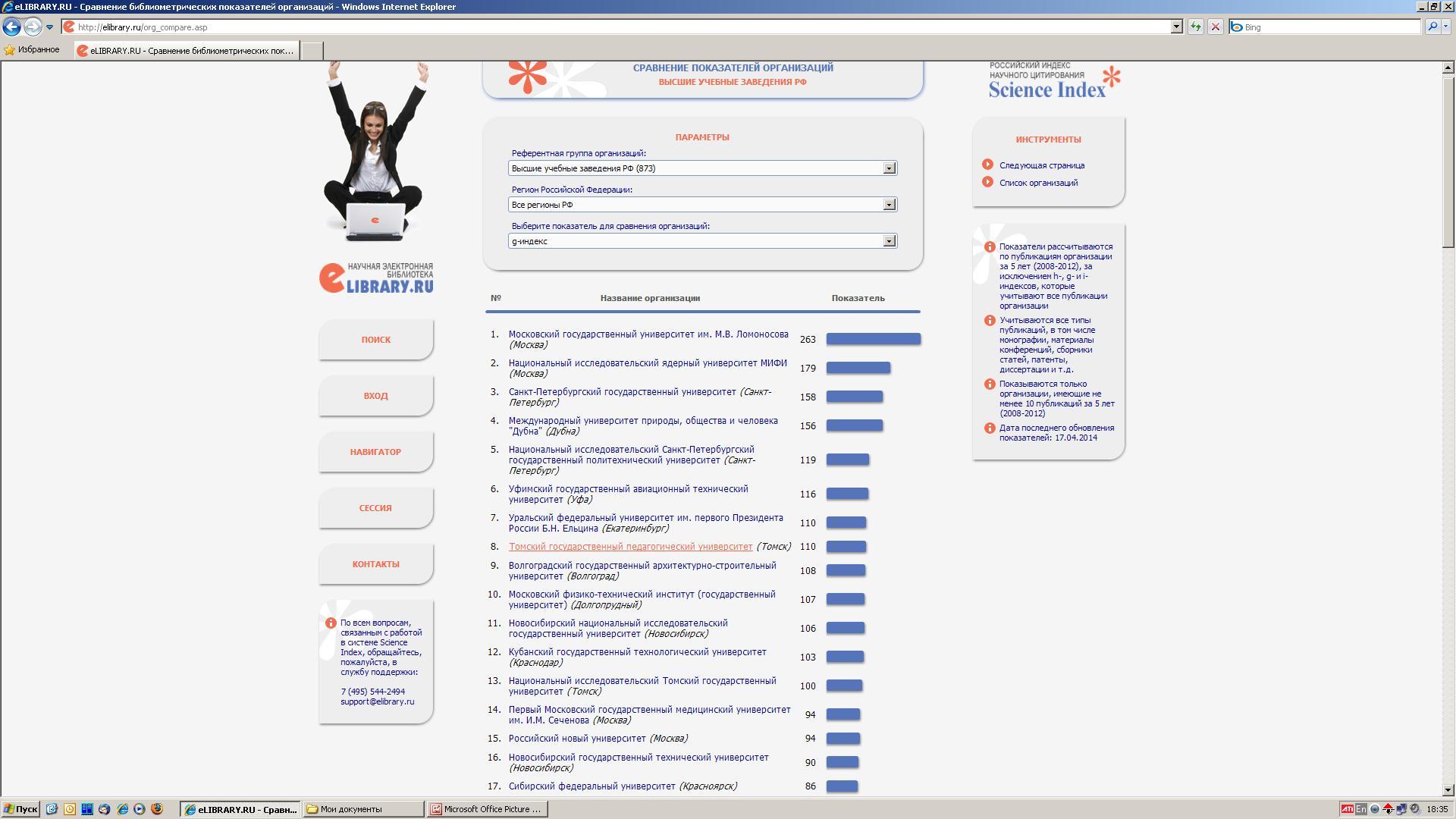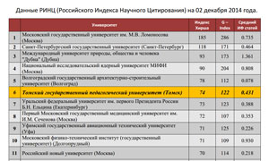 На 08.06.2016 по данным Российского индекса научного цитирования (РИНЦ): 1. ТГПУ занимает среди ВУЗов России по индексу цитирования Хирша 11 место, среди ВУЗов Томска - 1 место. 2. ТГПУ по g-индексу научного цитирования среди ВУЗов России занимает 10 место, среди ВУЗов Томска - 1 место. См. Приложение. |