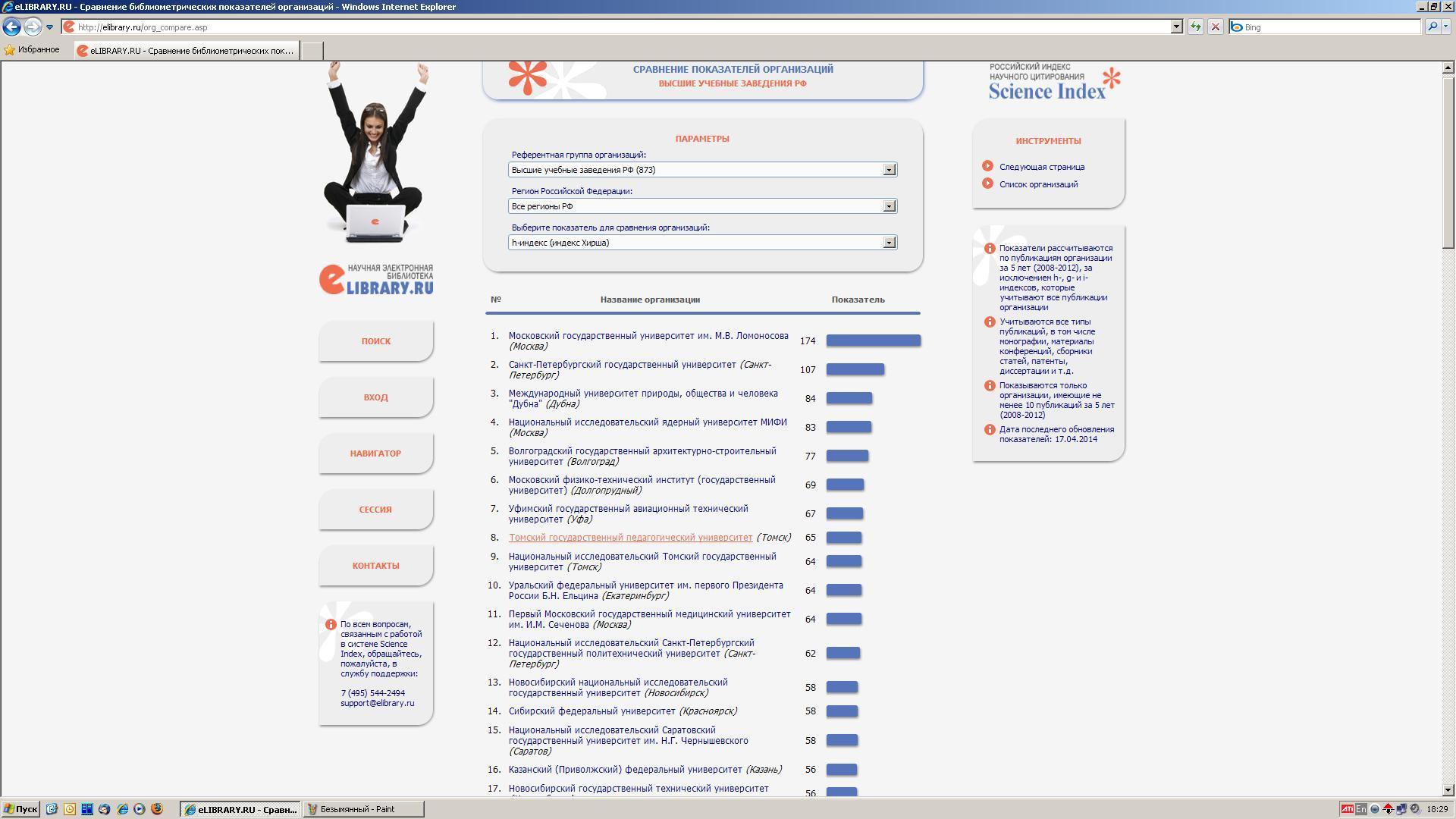 На 13.02.2017 по данным Российского индекса научного цитирования (РИНЦ): 1. ТГПУ занимает среди ВУЗов России по индексу цитирования Хирша 15 место, среди ВУЗов Томска - 1 место. 2. ТГПУ по g-индексу научного цитирования среди ВУЗов России занимает 10 место, среди ВУЗов Томска - 1 место. См. Приложение. |