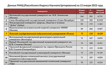 1. ТГПУ занимает среди ВУЗов России по индексу цитирования Хирша 5 место, среди ВУЗов Томска - 1 место.