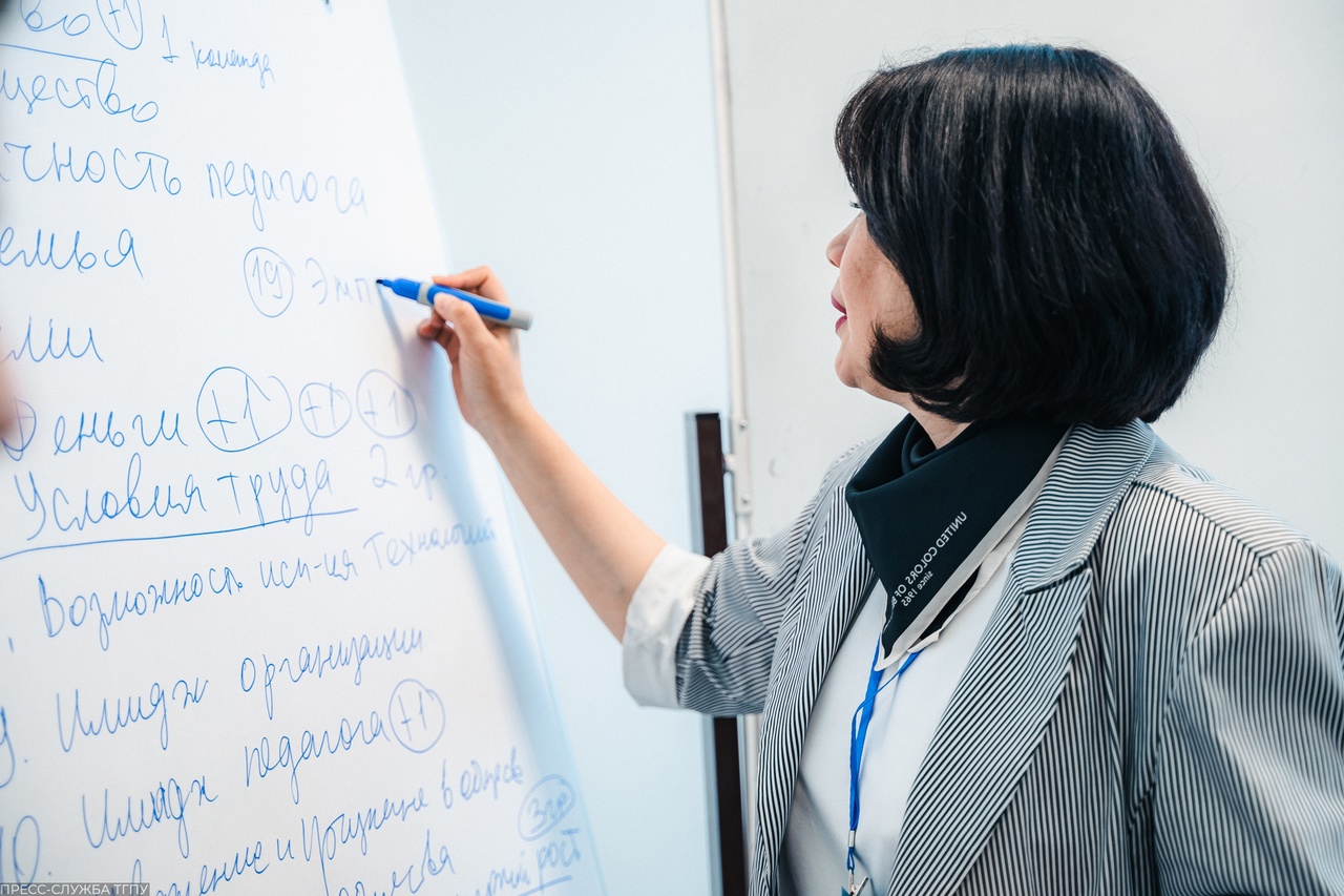 Одним из интересных форматов проведения была стратегическая сессия «Время решать: как поднять престиж педагогической профессии?», модератором которой выступила руководитель Парка инновационных образовательных практик ИРПО ТГПУ, директор Научно-методического центра сопровождения педагогических работников, кандидат биологических наук Лариса Валерьевна Куровская. В стратсессии приняли участие как опытные управленцы и педагоги, так и студенты ТГПУ.