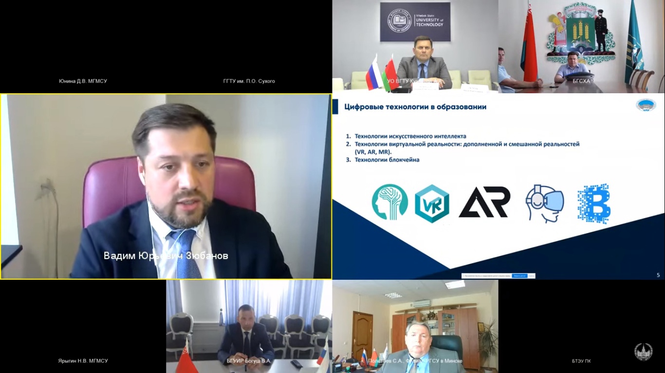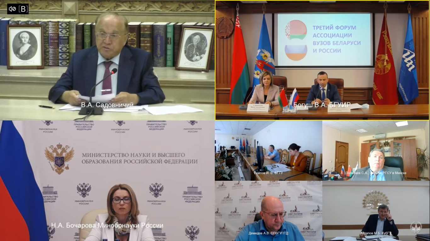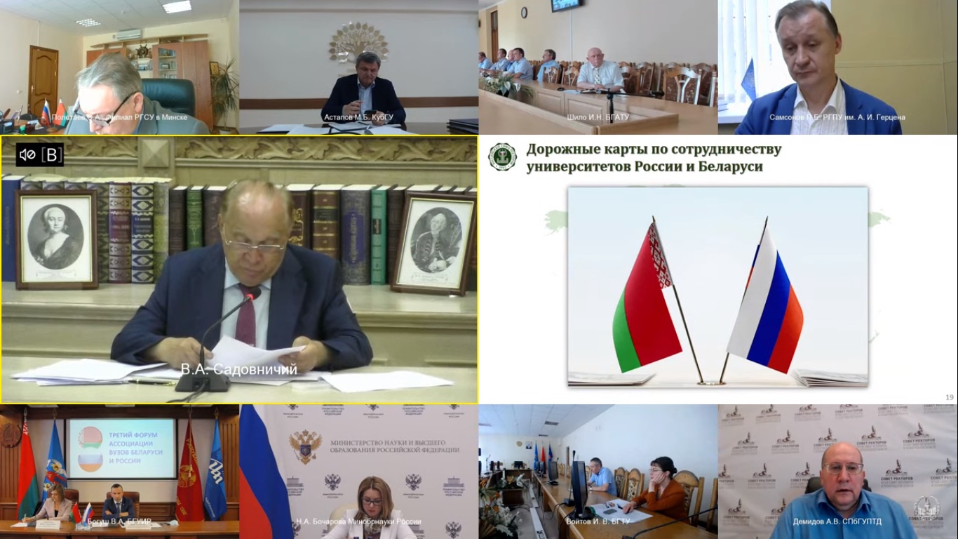 28 июня 2021 года на базе МГУ им. М.В. Ломоносова прошли мероприятия третьего Форума Ассоциации вузов России и Беларуси. Традиционно модераторами выступили президент Российского Союза ректоров, ректор МГУ, академик В.А. Садовничий и председатель Республиканского совета ректоров учреждений высшего образования Беларуси, ректор Белорусского государственного университета информатики и радиоэлектроники, профессор В.А. Богуш. Для обсуждения вопросов образовательного и научного сотрудничества вузов России и Беларуси Форум собрал руководителей и представителей университетов двух стран. От ТГПУ к участию присоединился В.Ю. Зюбанов, начальник Управления международного сотрудничества.