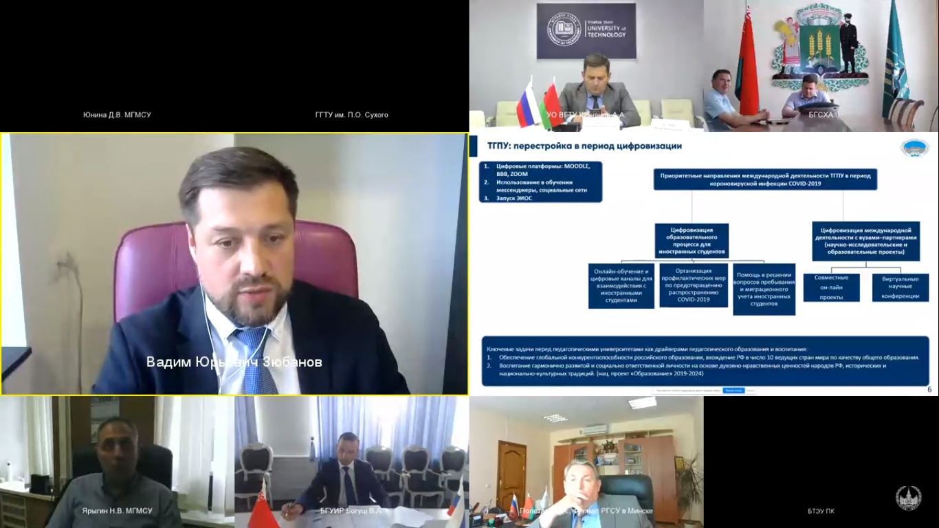 Вадим Юрьевич также вынес на обсуждение тему международного сотрудничества. Среди приоритетных направлений международной деятельности ТГПУ в период коронавирусной инфекции эксперт выделил активную реализацию виртуальной академической мобильности, организацию дистанционных курсов по русскому языку и другие мероприятия.