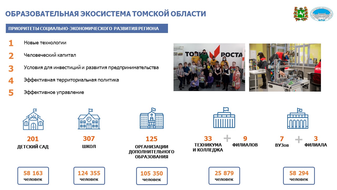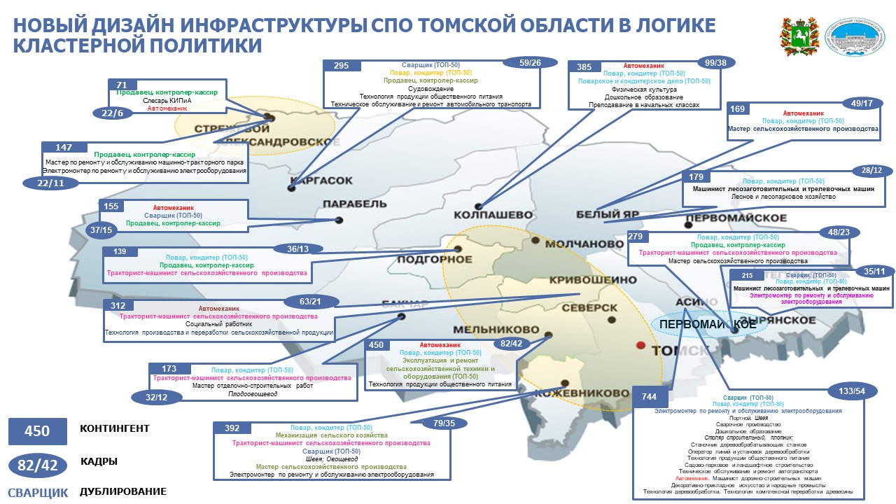 В начале своего выступления соавторы, как результат предварительно проведенной аналитической работы, представили ландшафт образовательной экосистемы Томской области. На сегодняшний день ее топография такова: детские сады – 201, школы – 307, организации дополнительного образования – 125, техникумы и филиалы – 35 и 9, вузы и филиалы – 7 и 9. В плане существующих в области организаций СПО и реализуемых ими профилей подготовки методом сравнительного-количественного анализа были выделены девять территориально-образовательных кластеров, каждый из которых имеет свою количественную представленность: лесопромышленный кластер (5), агропромышленный и промышленный кластеры (по 6), строительный и кластер здравоохранения (по 2), кластеры транспорта (8), сферы услуг (7), информационных технологий (1) и образования (3).