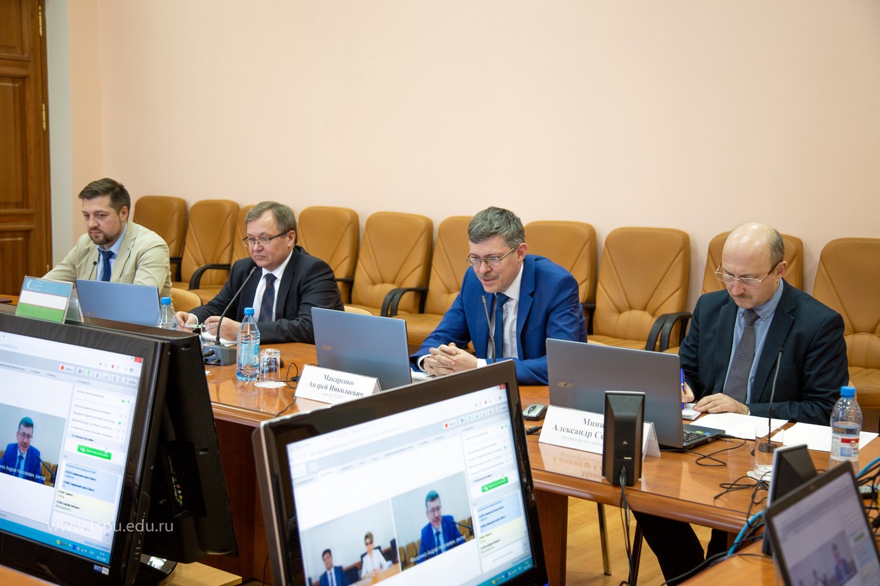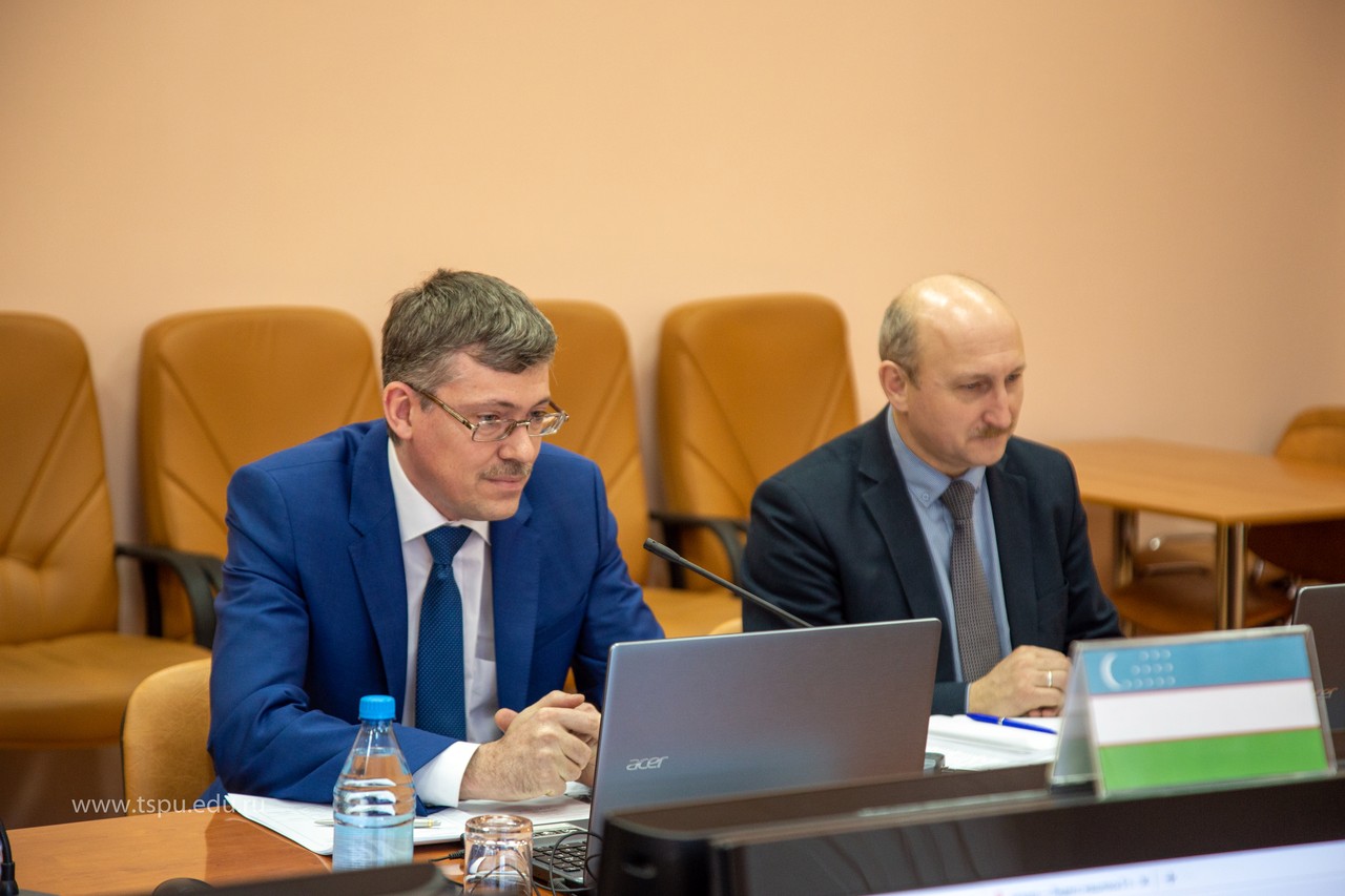 В формате телеконференции прошло совещание по вопросам совместной работы педагогических вузов Томска и Ташкента. В прямой эфир с коллегами из Узбекистана — ректором ТГПУ им. Низами Шавкатом Сафаровичем Шариповым и начальником отдела международного сотрудничества Ириной Виталиевной Панферовой — вышли ректор ТГПУ Андрей Николаевич Макаренко, проректор по учебной работе Александр Сергеевич Минич, проректор по международной деятельности Константин Евгеньевич Осетрин и начальник управления международного сотрудничества Вадим Юрьевич Зюбанов.