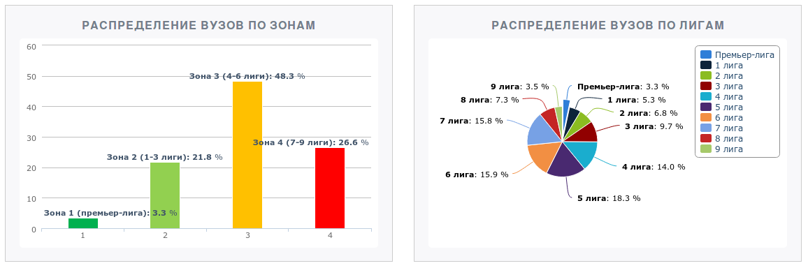 Всего в исследовании представлен анализ достижений 721 вуза России, в Первой лиге — только 38 вузов.