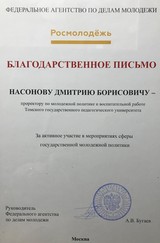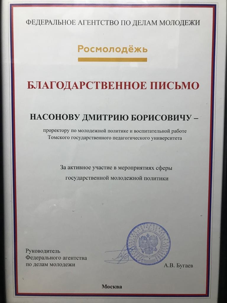 Руководитель Федерального агентства по делам молодежи «Росмолодежь» Александр Вячеславович Бугаев выразил благодарность проректору по молодежной политике и воспитательной работе Томского государственного педагогического университета Дмитрию Борисовичу Насонову за активное участие в мероприятиях сферы государственной молодежной политики.