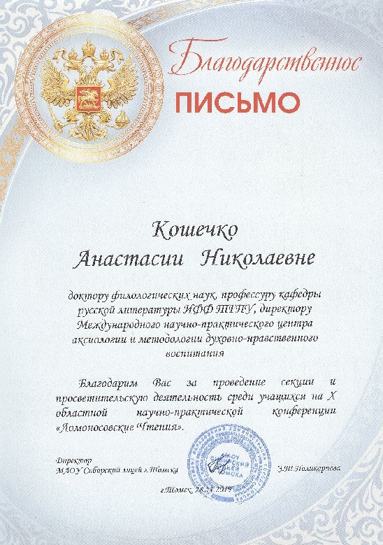 В Сибирском лицее г. Томска прошли мероприятия X областной научно-практической конференции «Ломоносовские чтения». Директор Международного научно-практического центра аксиологии и методологии духовно-нравственного воспитания, профессор ТГПУ А.Н. Кошечко приняла участие во встрече «Парад профессий».