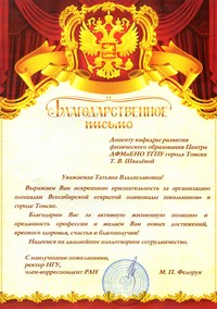 В начале учебного года в Центр дополнительного физико-математического и естественнонаучного образования ТГПУ пришло благодарственное письмо от ректора Новосибирского государственного университета за организацию Всесибирской открытой олимпиады школьников (ВООШ) в Томске. Благодарность адресована ответственному за работу на городской площадке, доценту кафедры развития физического образования ФМФ ТГПУ Т.В. Швалёвой.