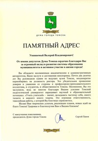 В своем письме от имени депутатов Думы Томска Сергей Юрьевич поблагодарил Валерия Владимировича за огромный вклад в развитие системы образования муниципалитета и активное участие в жизни города, и пожелал творческих успехов, реализации планов, новых идей на благо Томска!