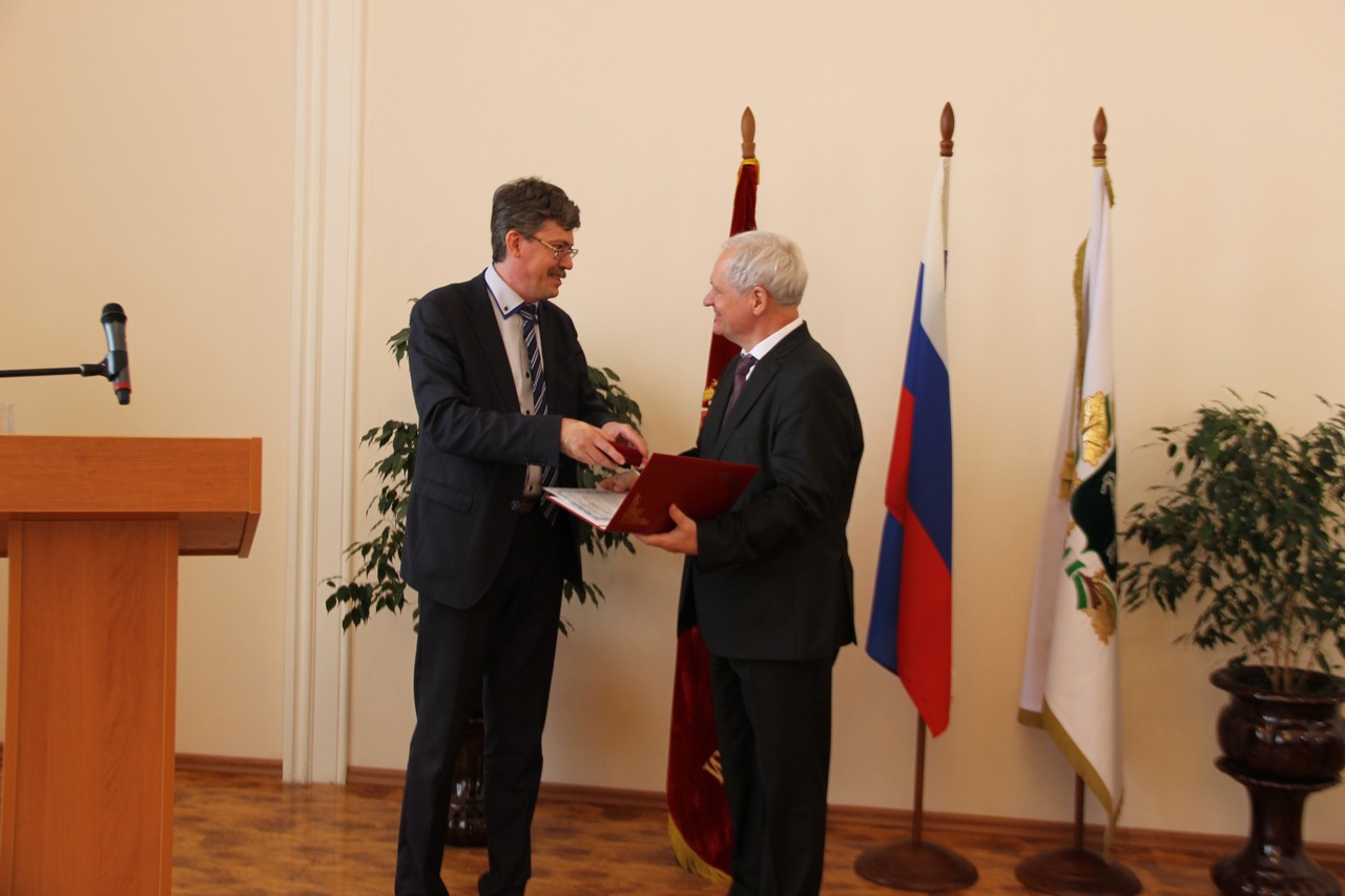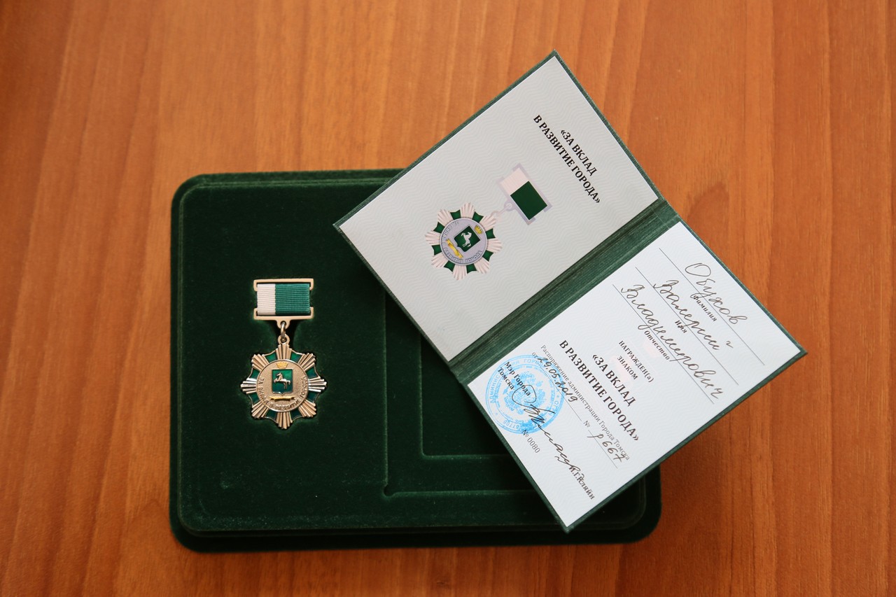 К.И. Чубенко поблагодарил В.В. Обухова за вклад в развитие системы образования Томска и по поручению Мэра И.Г. Кляйна вручил награду — Нагрудный знак «За вклад в развитие города».