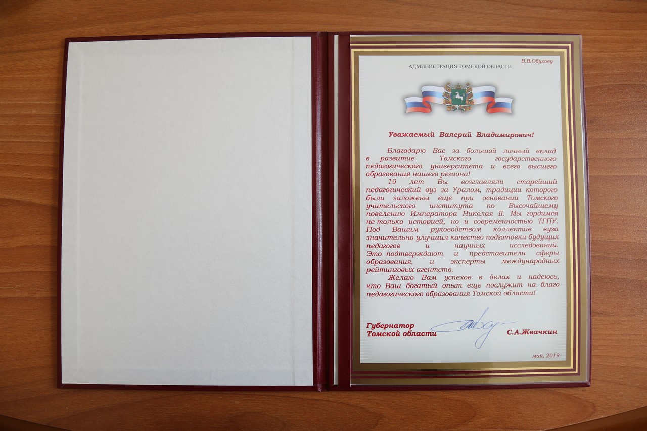 Памятный адрес поступил на имя ректора ТГПУ В.В. Обухова