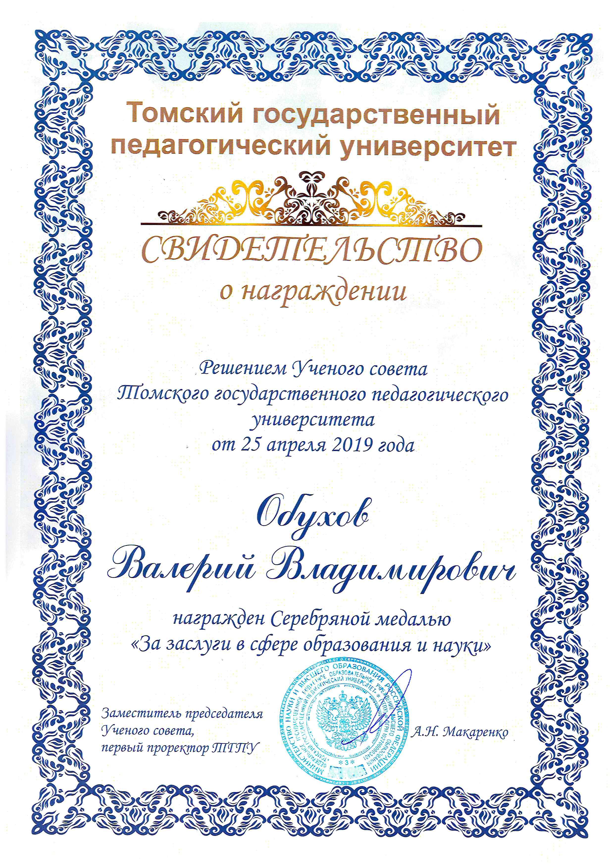 Выступившие на заседании дали высокую оценку достижениям вуза за прошедшие два десятилетия. За это время ТГПУ добился позиции лучшего педагогического вуза России. Особый вклад В.В. Обухова в развитие университета отмечен Ученым советом ТГПУ, который наградил ректора своей высшей наградой — Серебряной медалью «За заслуги в сфере образования и науки».
