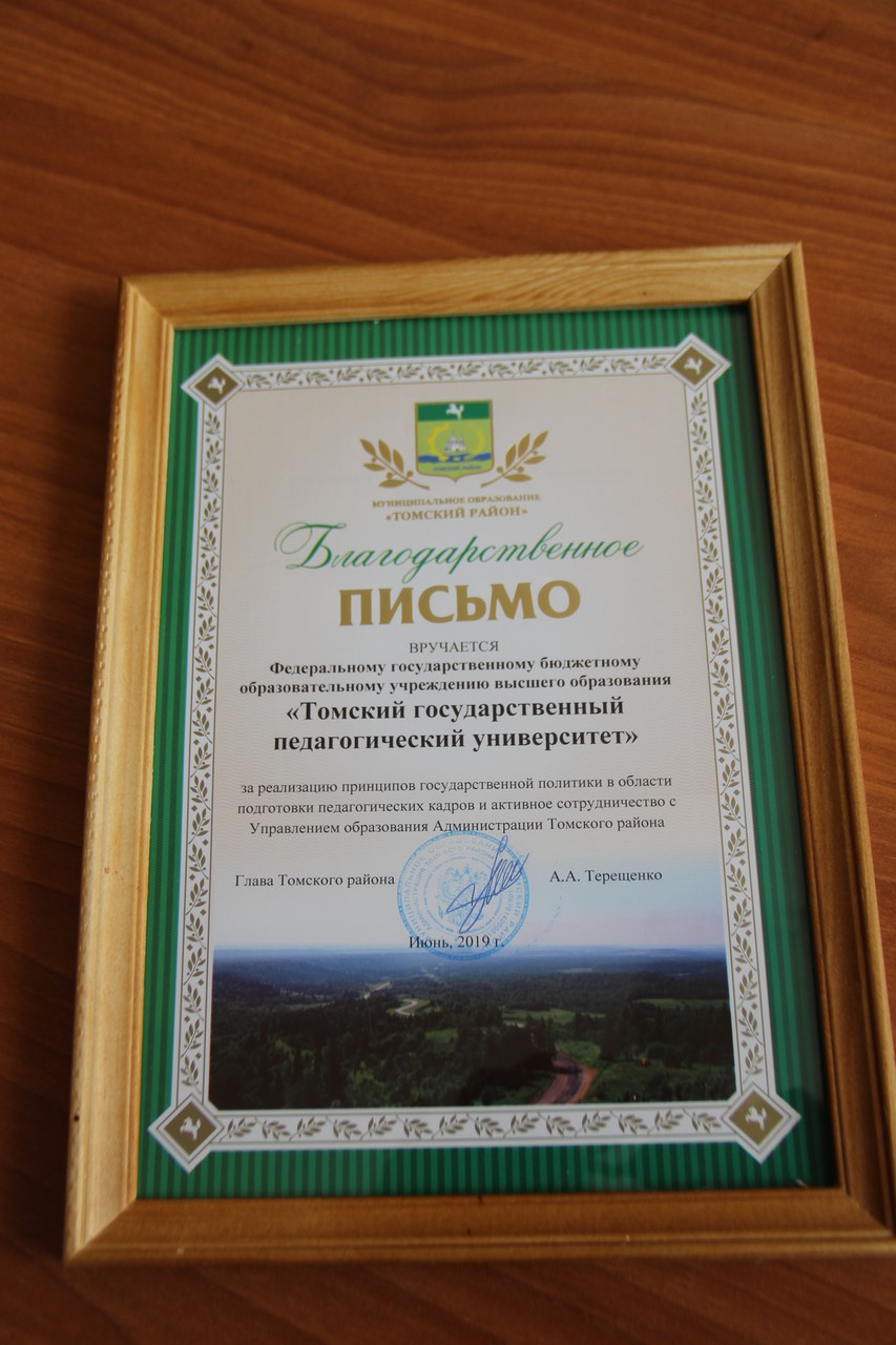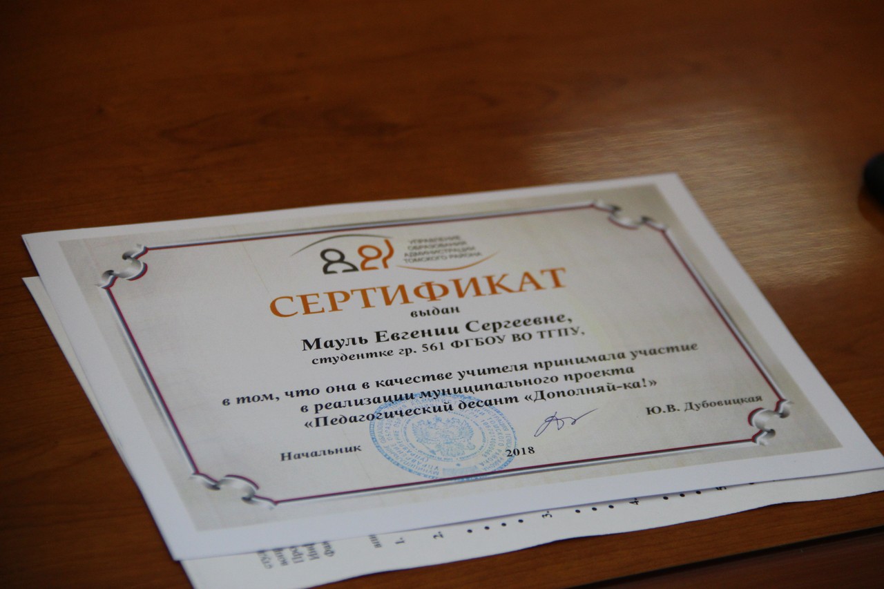 Открыла совещание проректор по учебной работе ТГПУ Марина Петровна Войтеховская. Начальник Управления образования Томского района Юлия Валерьевна Дубовицкая подвела итоги работы и поблагодарила всех присутствующих за успешную реализацию проекта. Она лично вручила грамоты и благодарственные письма Администрации Томского района, а также сертификаты участников проекта студентам ТГПУ.