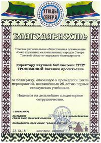 Томская региональная общественная организация «Союз коренных малочисленных народов Севера Томской области» в лице президента Союза И.А. Коробейниковой выразила благодарность директору Научной библиотеки Томского государственного педагогического университета Трофимовой Евгении Арсентьевне за поддержку, оказанную в проведении цикла мероприятий, посвященных 25-летию первых селькупских учебников.