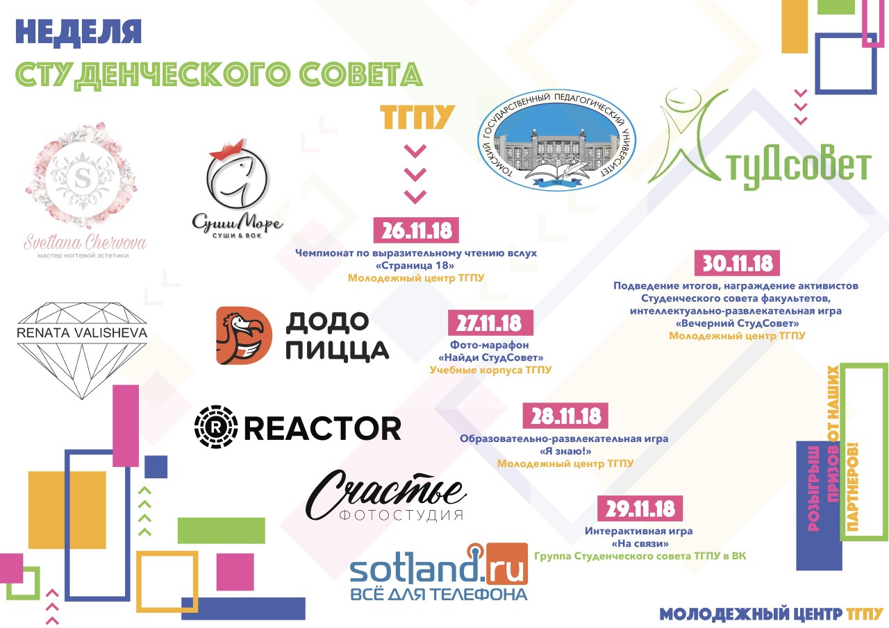 Уже сегодня, 26 ноября, участники Недели Студенческого совета покажут свои ораторские способности на Чемпионате по выразительному чтению «Страница 18» (17.00, Молодежный центр ТГПУ). А впереди активистов ждут фото-марафон «Найди Студ. совет», цель которого — собрать эмблемы структуры в корпусах университета; образовательно-развлекательная игра «Я знаю», которая испытает участников арсеналом в сотню общеобразовательных вопросов; состязание «На связи», где обучающиеся смогут проявить свои навыки в режиме онлайн, правильно ответив на интерактивные вопросы, появляющиеся в группе Студенческого совета в социальной сети ВКонтакте; интеллектуальное соревнование «Вечерний Студ. совет».