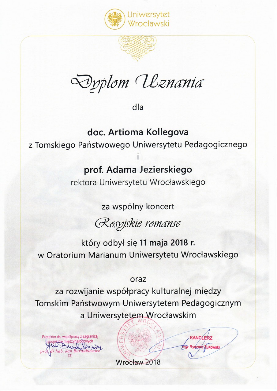 По традиции студенты факультета иностранных языков и преподаватели ТГПУ принимают участие в творческих конкурсах, организованных в университете города Вроцлав (Польша). В этом году 11 мая программу вокальных мероприятий сольным концертом открыл Артем Константинович Коллегов, кандидат педагогических наук, доцент кафедры общей педагогики и психологии ИПиП ТГПУ. Как отмечают коллеги из польского университета, крепкий творческий дуэт сложился у Артема Константиновича и ректора вроцлавского вуза, профессора Адама Езерского, который исполняет аккомпанемент на фортепиано.
