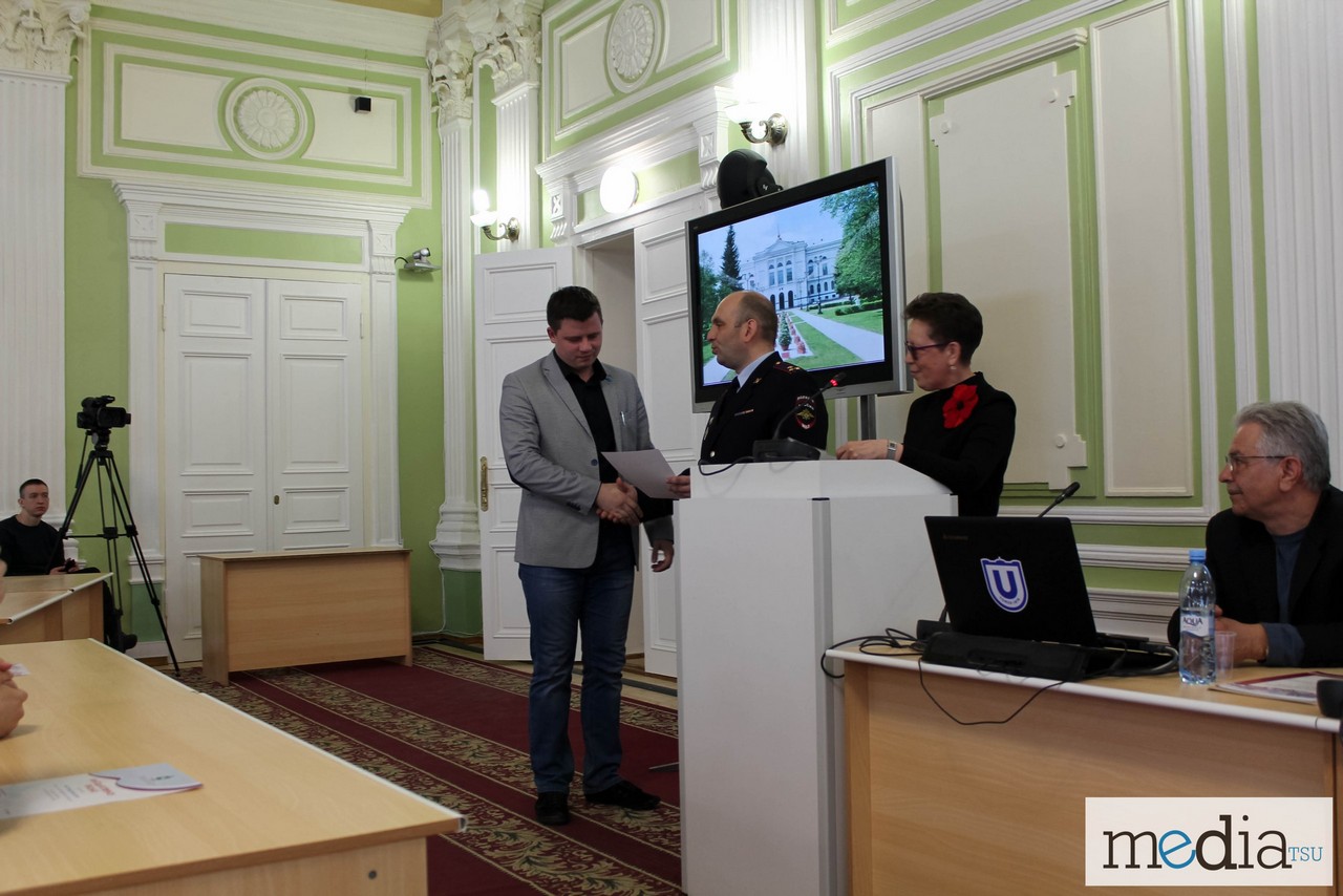 Приветственными словами открыла встречу председатель Общественного совета при УМВД России по Томской области Татьяна Зуевич. Перед представителями студенческих отрядов правоохранительной направленности выступил советник Губернатора Томской области Александр Селиванов. Председатель комитета общественной безопасности администрации города Томска Сергей Сладкин вручил отличившимся представителям движения почетные грамоты. От нашего вуза этой грамоты был удостоен руководитель Центра патриотического воспитания ТГПУ К.А. Черенков.