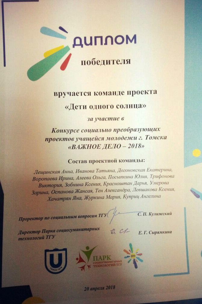 Студенты-активисты волонтерского отряда «Точка зрения» ТГПУ представили проект «Дети одного солнца» на конкурс социально преобразующих проектов учащейся молодежи г. Томска «Важное дело — 2018» и одержали победу.