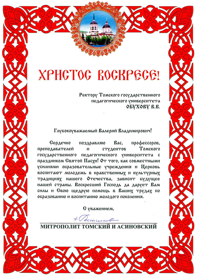 Митрополит Томский и Асиновский Ростислав поздравляет профессоров, преподавателей и студентов Томского государственного педагогического университета с праздником Святой Пасхи.