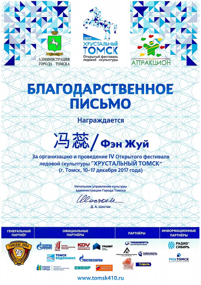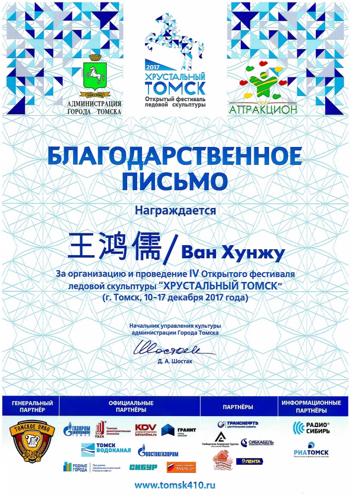 Фэн Жуй и Ван Хунжу выступили волонтерами-переводчиками на IV Открытом фестивале ледовой скульптуры "Хрустальный Томск", прошедшем в нашем городе в преддверии новогодних праздников. Ребята сопровождали делегацию из города Харбин (Китай), представители которой стали участниками творческого конкурса в Томске.