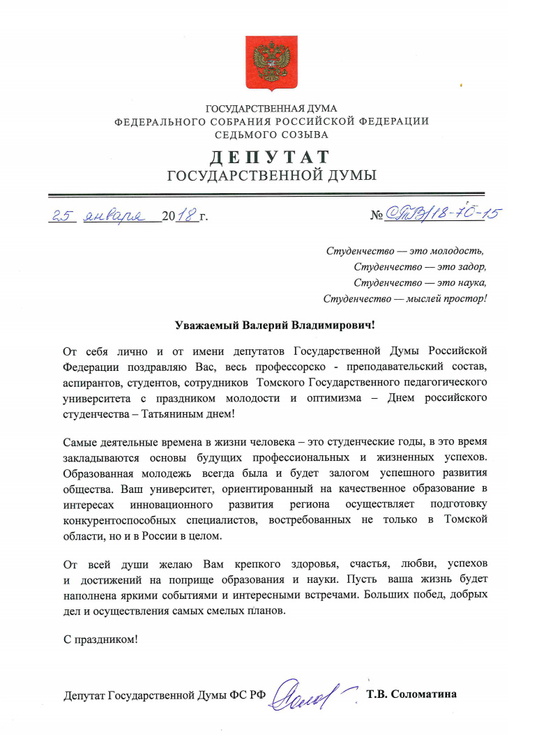 Депутат Государственной Думы Федерального Собрания Российской Федерации Татьяна Васильевна Соломатина поздравляет коллектив Томского государственного педагогического университета с праздником молодости и оптимизма - Днем российского студенчества - Татьяниным днем!