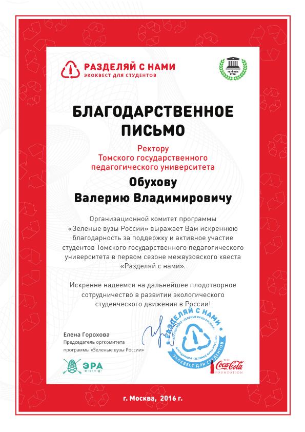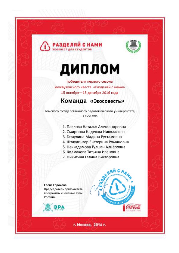 Команда факультета экономики и управления Томского государственного педагогического университета, вошедшая в число лидеров Всероссийского экологического квеста «Разделяй с нами», 17 февраля 2017 в Москве представила вуз на учредительной конференции Ассоциации «Зеленых вузов России».
