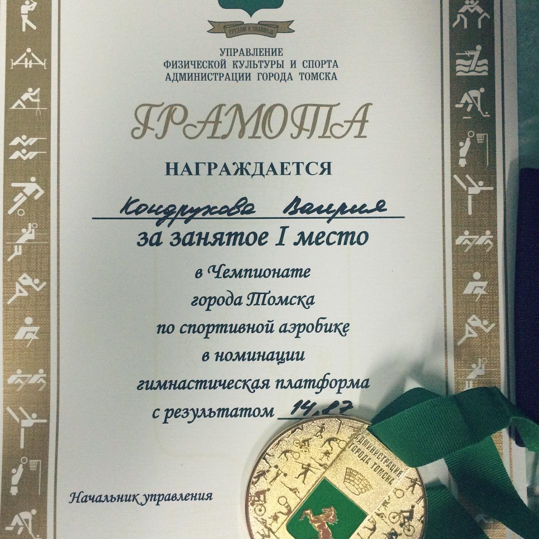 Студентка Томского государственного педагогического университета завоевала победу в одной из номинаций Чемпионата города Томска по спортивной аэробике. В состязании приняли участие студенты трех томских вузов: ТГПУ, ТУСУР и ТГАСУ. В номинации "Гимнастическая платформа" соревновались около 20 спортсменов, однако победу удалось одержать Валерии Кондруховой, студентке факультета физической культуры и спорта ТГПУ. Спортсменка выбилась вперед с результатом 14.87 и была награждена грамотой победителя и золотой медалью Администрации города Томска.