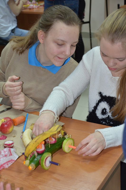 Накануне тьюторы провели для своих школьных бизнес-команд тренинг на рождение проектной идеи. Поэтому целью игры было практическое закрепление полученных знаний: запустить у участников процесс генерации неординарных идей с использованием творческого мышления в условиях ограниченных ресурсов. Ребята получили задание: сделать из подручных материалов (овощей и фруктов) машины, с таким условием, чтобы потом победить в импровизированной гонке. Критериями при выявлении победителя были: дальность и быстрота поездки, надежность получившейся машины, творческий подход.