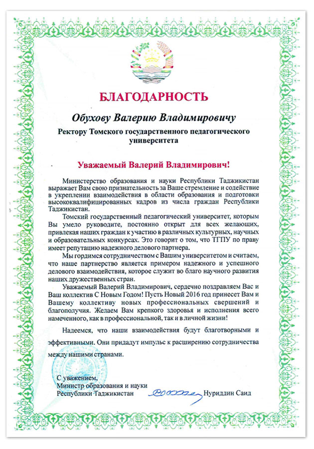 Министр образования и науки Республики Таджикистан Нуриддин Саид выразил признательность Томскому государственному педагогическому университету в лице ректора ТГПУ В.В. Обухова за содействие в укреплении взаимодействия в области образования и подготовки высококвалифицированных кадров из числа граждан Республики Таджикистан.