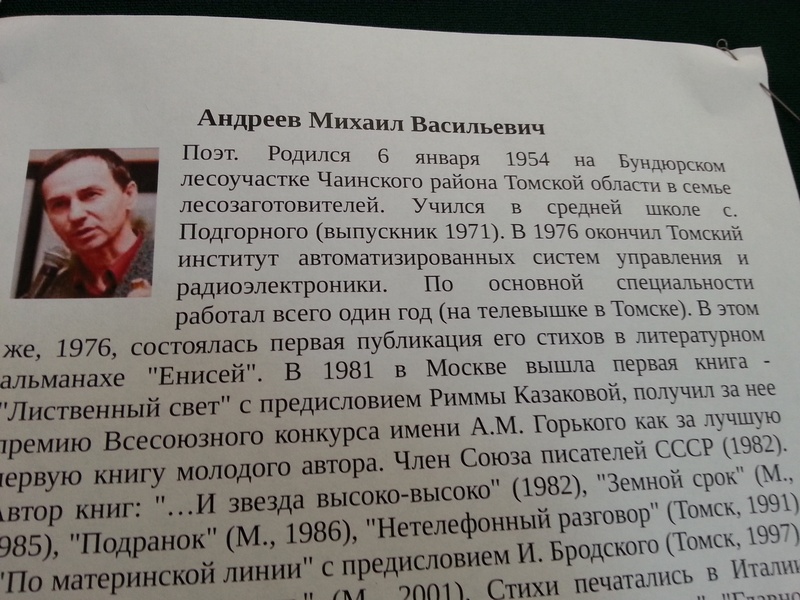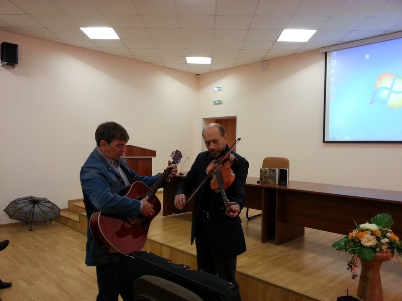 В Научной библиотеке Томского государственного педагогического университета прошла музыкально-литературная встреча с известными российскими поэтами - Михаилом Андреевым и Сергеем Максимовым. Встреча с гостями сопровождалась не только чтением стихов и исполнением авторских песен: "Почему так в России берёзы шумят", но и живым общением, позитивными рассказами о жизни и творчестве поэтов. Особую атмосферу вечера создали утонченные и мелодичные звуки скрипки Андрея Чудакова (ТГУ).