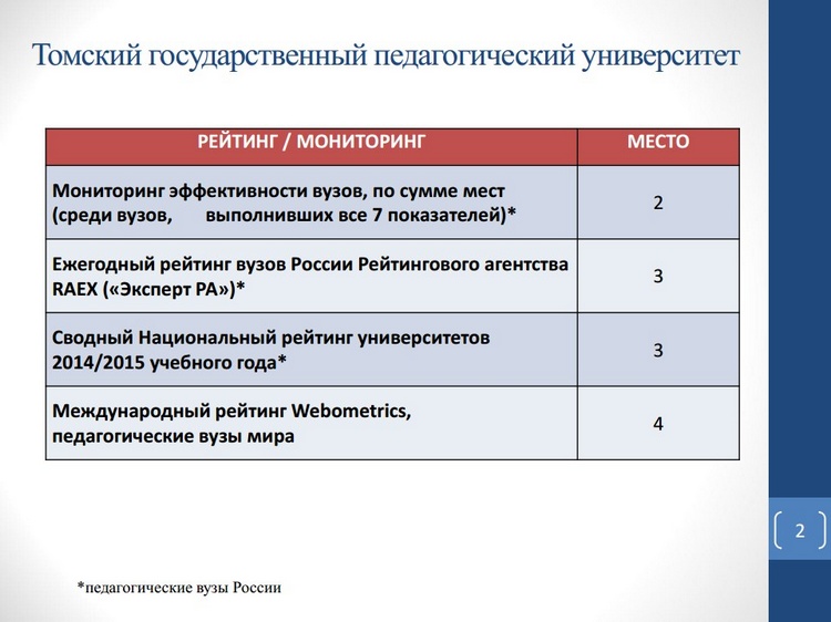 Томский государственный педагогический университет вошел в топ - 50 российских вузов рейтинга Webometrics, поднявшись с 71 на 47 место. При этом он показал четвёртый результат среди всех педагогических университетов мира. Сегодня этот рейтинг считается одним из наиболее авторитетных.