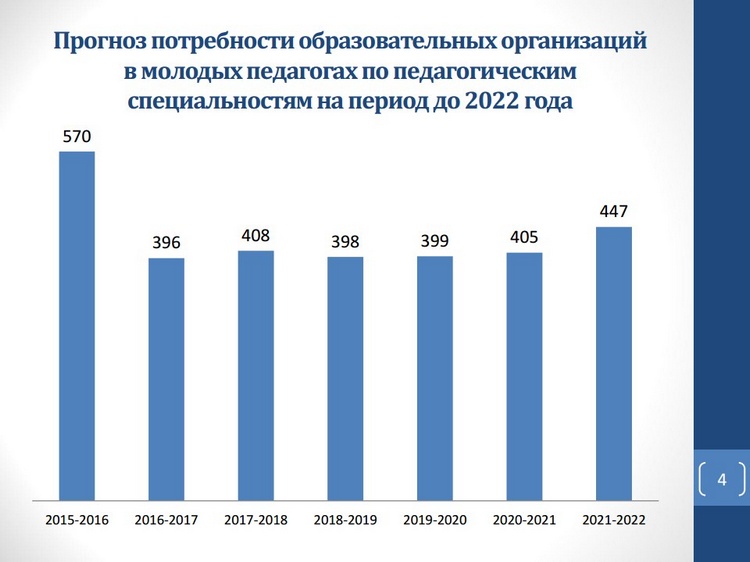 Подготовлен прогноз потребностей в педагогических кадрах на период до 2021 года с учетом демографических изменений и с указанием профилей востребованных педагогов; определены направления деятельности по повышению уровня образования и квалификации работающих педагогов.