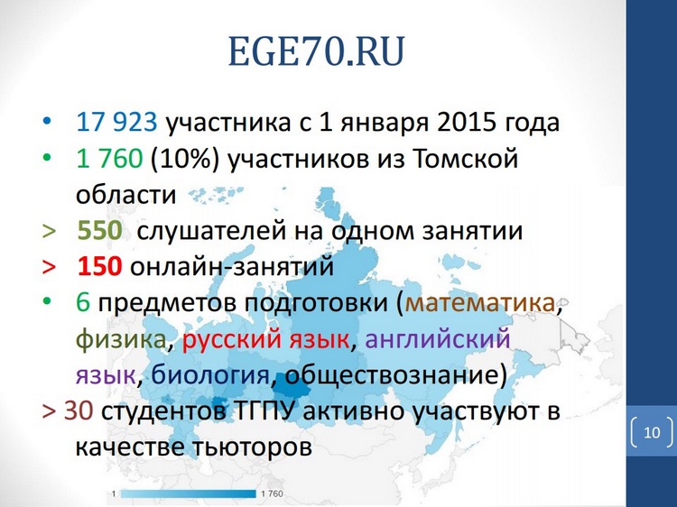 Проект ЕГЭ-70 стартовал в 2014 году и представляет собой образовательный интернет-ресурс, посетители которого имеют возможность принять участие в интерактивных онлайн-занятиях. Бесплатные занятия проводят студенты ТГПУ. Разбираются типовые задачи ЕГЭ по математике, физике, русскому языку, английскому языку, биологии и обществознанию.