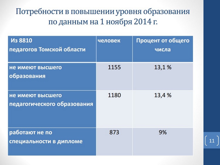 Не вдаваясь в подробности – они представлены на слайдах – отмечу, что дефицит педагогических кадров нарастает и если не предпринять действенных мер, то уже через несколько лет он обернётся полномасштабным кадровым кризисом, особенно в сельских школах. Предотвратить кризис возможно только за счет стратегического партнёрства, за счет активных совместных усилий систем общего и педагогического образования Томской области.