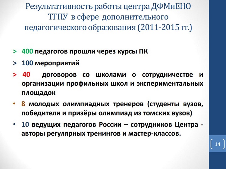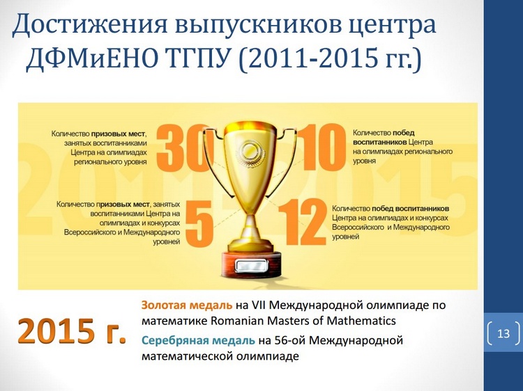 Видимые результаты работы – это победы томичей - воспитанников Центра - на олимпиадах по физике и математике высокого уровня, чего раньше не было. Особо значимая – серебряная медаль Никиты Гладкова на 56-ой Международной математической олимпиаде.