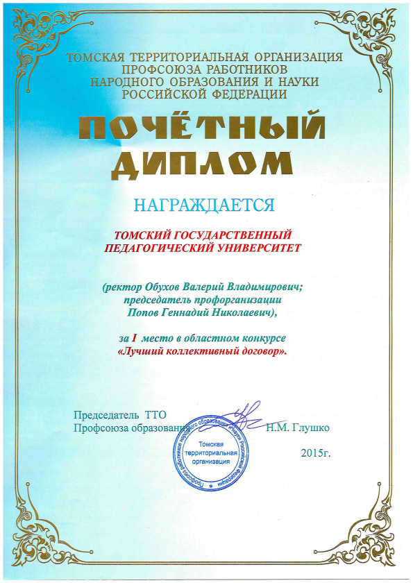 Томский государственный педагогический университет в лице ректора Обухова Валерия Владимировича и председателя профсоюзной организации Попова Геннадия Николаевича был награжден Почетным дипломом за I место в областном конкурсе "Лучший коллективный договор". Ежегодно конкурс, участниками которого являются первичные профсоюзные организации предприятий и учреждений различных форм собственности, проводится в целях совершенствования и обобщения положительного опыта.