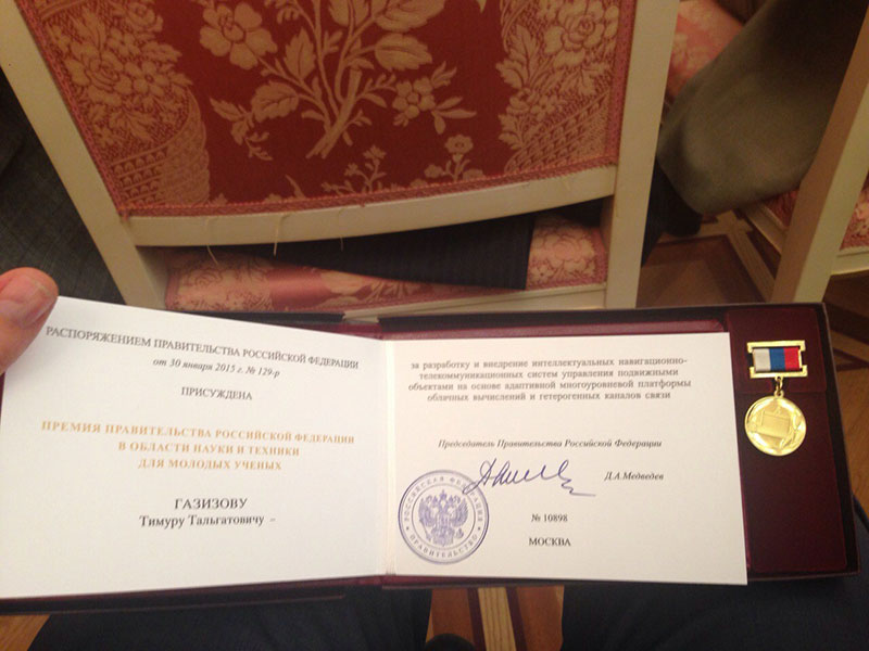 21 мая 2015 года премьер-министр РФ Дмитрий Медведев, вручил премии в области науки и техники, которые были специально учреждены Правительством для молодых учёных.