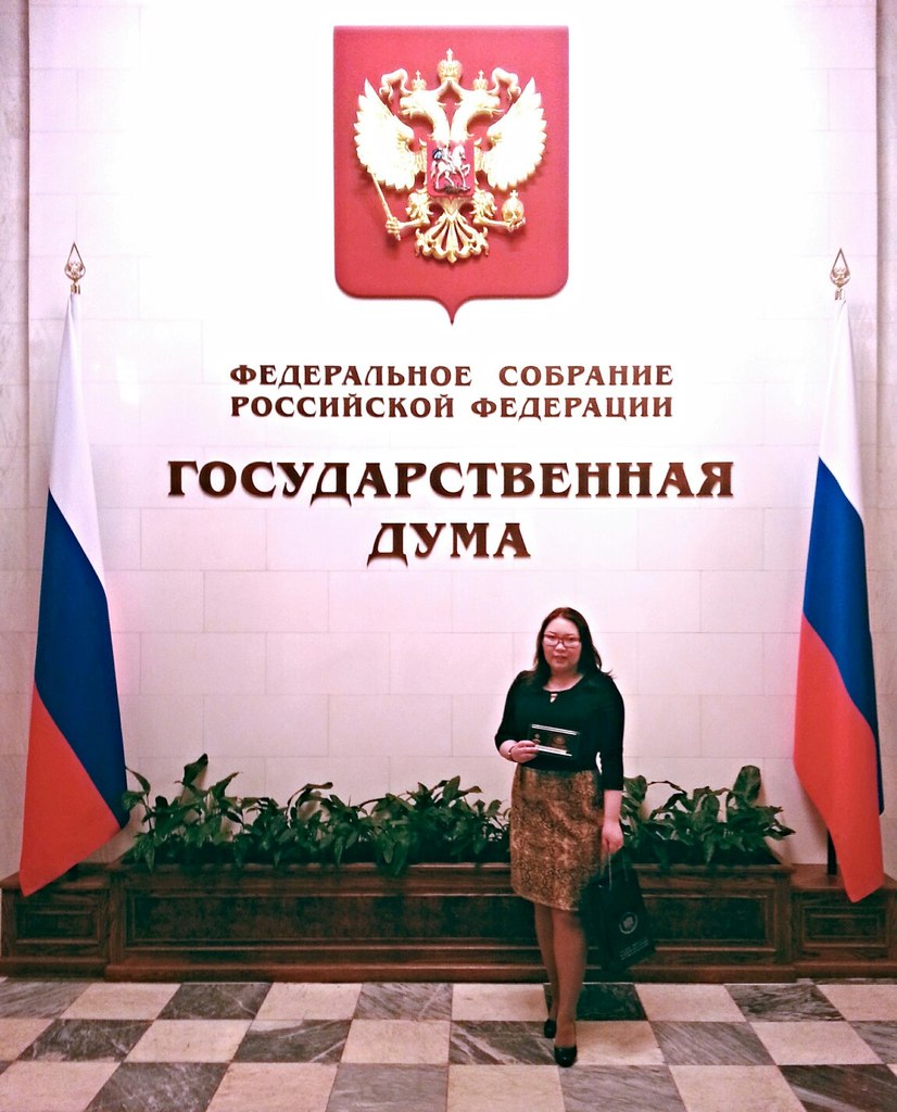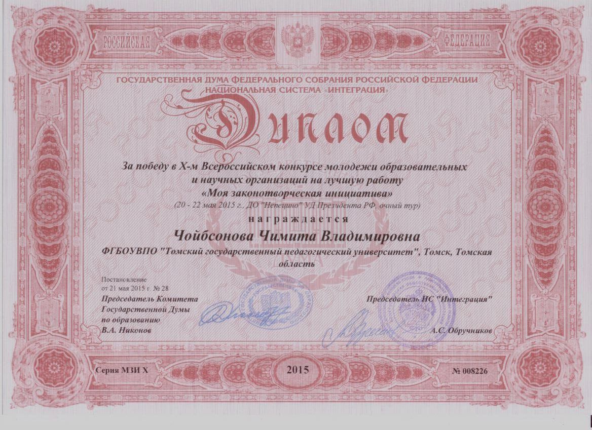 На конкурс было направлено более 600 законотворческих проектов со всей России, из них только 30 были отмечены дипломами различной степени. От Томского государственного педагогического университета была представлена работа Чойбсоновой Ч.В. на тему «Антикоррупционное образование в высших учебных заведениях», направленная на внесение изменений во ФГОС ВПО. Экспертное жюри Конкурса оценило высокий уровень разработанности проблемы и научную новизну представленной работы в номинации «Образование». В результате, в торжественной обстановке, в Малом зале заседаний Государственной Думы, Заместитель председателя Комитета по образованию Государственной Думы вручил Чимите Владимировне Диплом победителя и Знак отличия «Депутатский резерв Государственной Думы Федерального Собрания Российской Федерации».