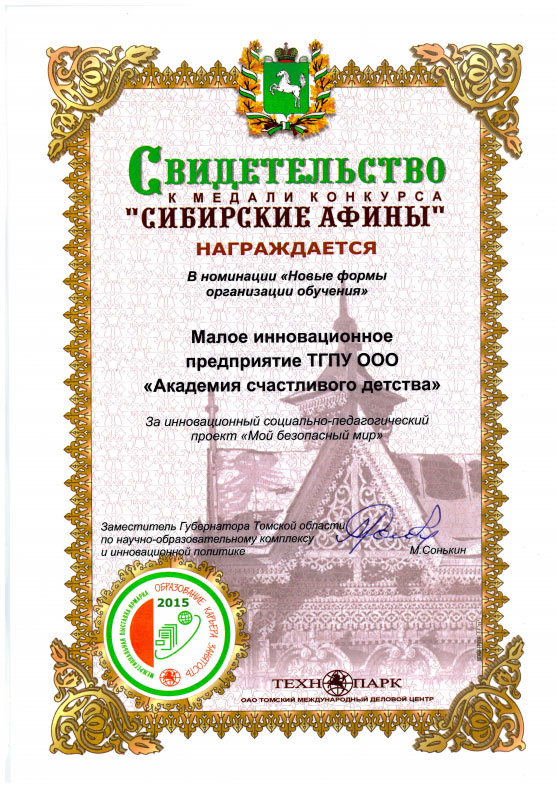 Медалью конкурса "Сибирские Афины" в номинации "Новые формы организации обучения" награжден инновационный социально-педагогический проект "Мой безопасный мир", подготовленный сотрудниками Малого инновационного предприятия ТГПУ ООО "Академия счастливого детства" Еленой Дмитриевной Файзуллаевой, Наталией Анатольевной Медовой.