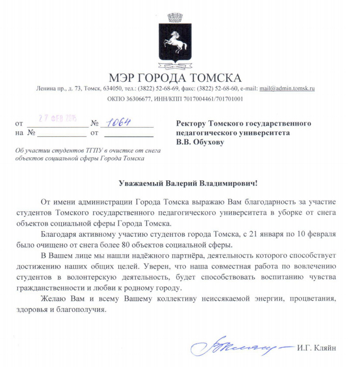 Мэр города Томска выразил благодарность ректору ТГПУ за участие студентов Томского государственного педагогического университета в очистке от снега объектов социальной сферы города Томска.