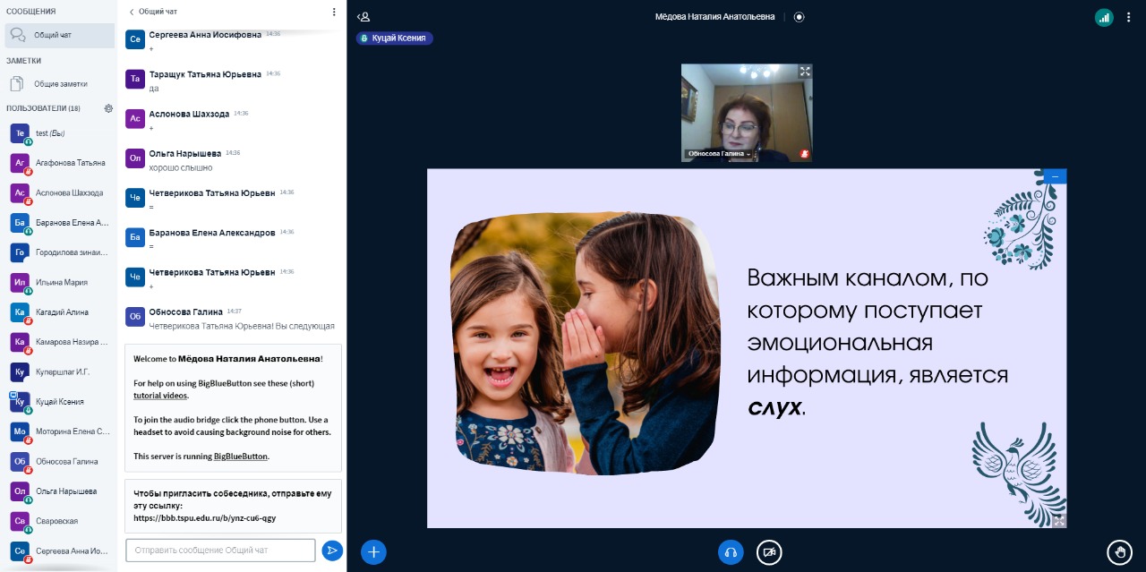На третьей секции «Детская художественная литература в коррекционно-развивающей работе» вместе с куратором, кандидатом педагогических наук, доцентом кафедры дефектологии ФПСО ТГПУ Обносовой Галиной Петровной участники осветили проблемы детского здоровья и роль чтения в их решении, в том числе на примере произведений конкретных авторов.