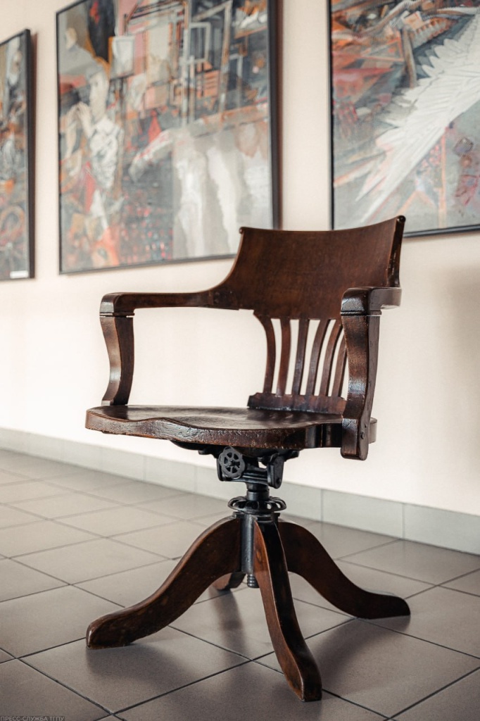 В комплекте к столу в мемориальной коллекции А.М. Волкова имеется красивое старинное деревянное кресло с подлокотниками. Уникальность креслу придает его механизм, позволяющий ему крутиться и даже регулировать высоту.